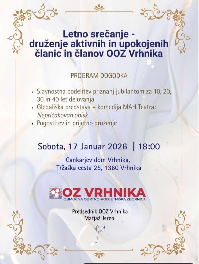 Vabimo vas na prijetno druženje aktivnih in upokojenih članic ter članov OOZ Vrhnika, kjer bomo skupaj obeležili uspešno delo ter podelili jubilejna priznanja za leto 2025.